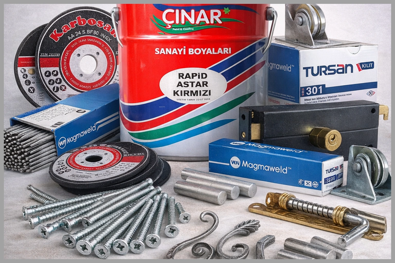 Yüzey koruma ve dayanım sağlayan metal boya, antipas ve tiner ürünlerimiz uygulamalarda uzun ömürlü performans sunar. Kesme ve şekillendirme işlemleri için geliştirilen kesiciler ve taşlama çözümlerimiz yüksek verimlilik sağlarken; montaj ve sabitleme süreçlerinde kullanılan vida, menteşe ve sürgü sistemlerimiz güvenli kullanım oluşturur. Kaynak uygulamalarında tercih edilen elektrot ve kilit mekanizmaları ise projelerinize sağlam, profesyonel ve bütüncül hırdavat çözümleri kazandırır, endüstriyel standartlarda maksimum dayanıklılık sağlar.
