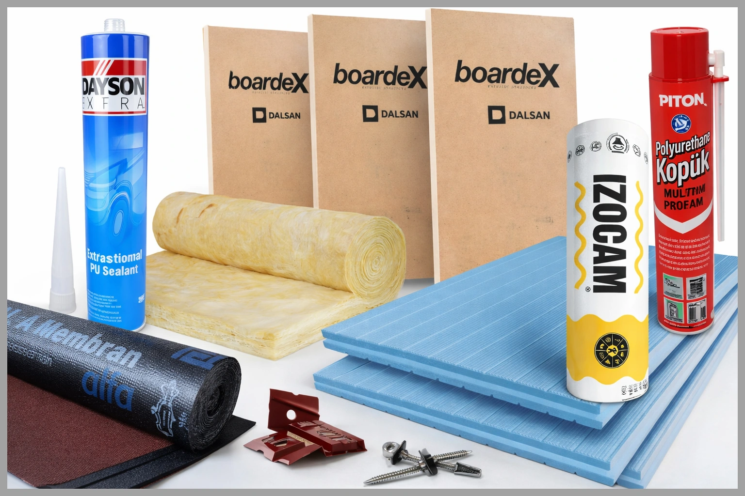 Yüksek ısı, ses ve nem yalıtımı sağlayan boardex, izocam ve folyolu izocam çözümlerimiz yapılarda enerji verimliliği ve uzun ömürlü koruma sunar. Yüzey ve çatı uygulamalarında etkin performans sağlayan mebran ve xpyes ürünlerimiz sistem bütünlüğünü desteklerken; montaj ve sızdırmazlık için geliştirilen dayson silikon ve piton köpük seçeneklerimiz projelerinize güvenli ve profesyonel yalıtım çözümleri kazandırır, yüksek dayanım sağlar ve maksimum verimlilik ile sürdürülebilir kullanım.